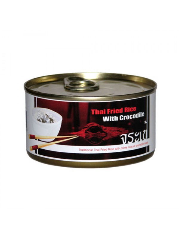 Exotic Canned Thai Fried Rice with Crocodile meat. Compared to other meats, crocodile is low in fat, low in calories and high in protein. Trimmed Crocodile can be low in saturated fats and high in mono unsaturated fat and is considered a good source of niacin and vitamin B12. We have infused our traditional Thai Fried Rice with select prime trimmed crocodile meat to create unique gourmet Thai dish. Why not serve it to unsuspecting guests at your next dinner party and make them guess what they're eating? We also produce many other interesting exotic meat products, such as creamy red curry with snake, Emu fried rice and much more. Please check out the rest of our site. All our products have passed Thai FDA health and safety standards.