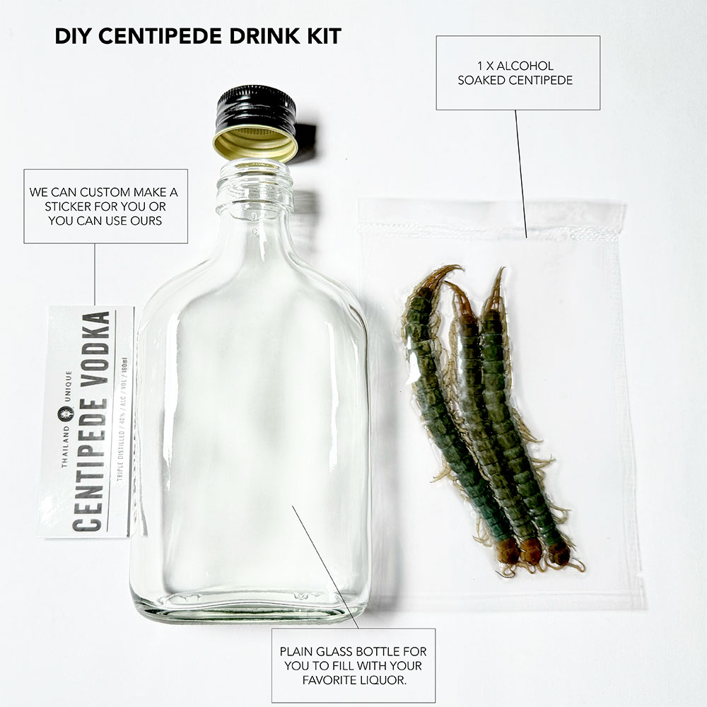 Please note: Due to international shipping regulations, our Centipede Vodka is available for local delivery only. For global customers, we offer DIY infusion kits for you to make your own. Your DIY kit includes a glass bottle, a carefully prepared alcohol-soaked centipede, and custom stickers. Simply place the centipede into the bottle, fill it with your choice of vodka, tequila, or any strong spirit, and let it steep for a few weeks (or months if you have the patience) to unlock its unique flavour. Want a personalised touch? Send us your artwork, and we’ll print a custom label just for you.